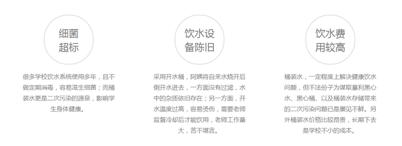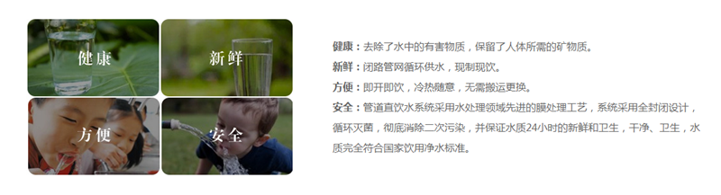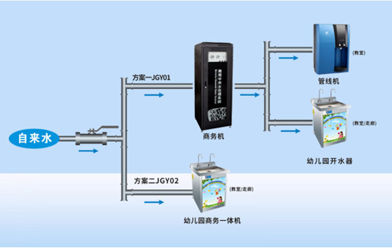 兒童的安全健康飲水問題是家長和老師一直以來的關心的問題,而對于萌芽時期的小朋友的來說,大大增加“病從口入”的幾率,為保證幼兒飲水的安全健康,現在眾多幼兒園為了吸引新生在幼兒園內安裝了直飲水機。采用RO反滲透技術可全面解決自來水中存在的問題,使終端飲用水更加健康、干凈。 國內幼兒園飲用水面臨的問題: 直飲水的優點: 幼兒園直飲水解決方案圖: 方案設計: 一站式服務:售前免費施工方案,售中免費現場調試設備,售后免費客戶技術人員培訓,準確的說,我們不是賣產品,我們是在賣服務。