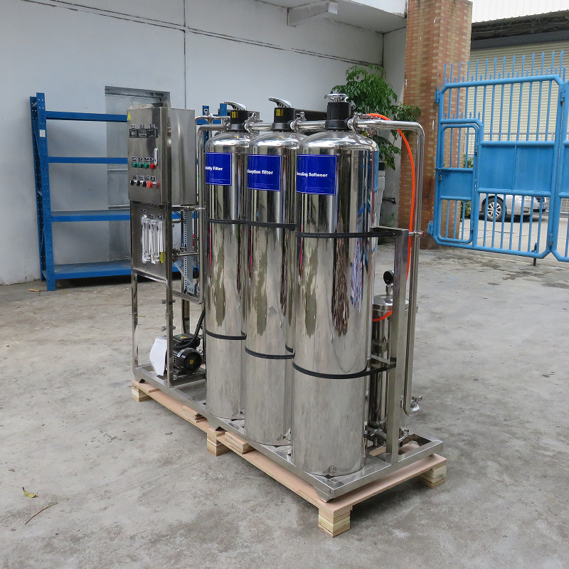 流程: 原水 → 原水箱 → 原水泵 →多介質過濾器 (石英砂過濾器)→活性炭過濾器 →軟水處理器(添加阻垢劑裝置) → 精密過濾器 → 高壓泵 → 一級反滲透(RO)裝置 →紫外線殺菌裝置(臭氧殺菌裝置) → 用水點
